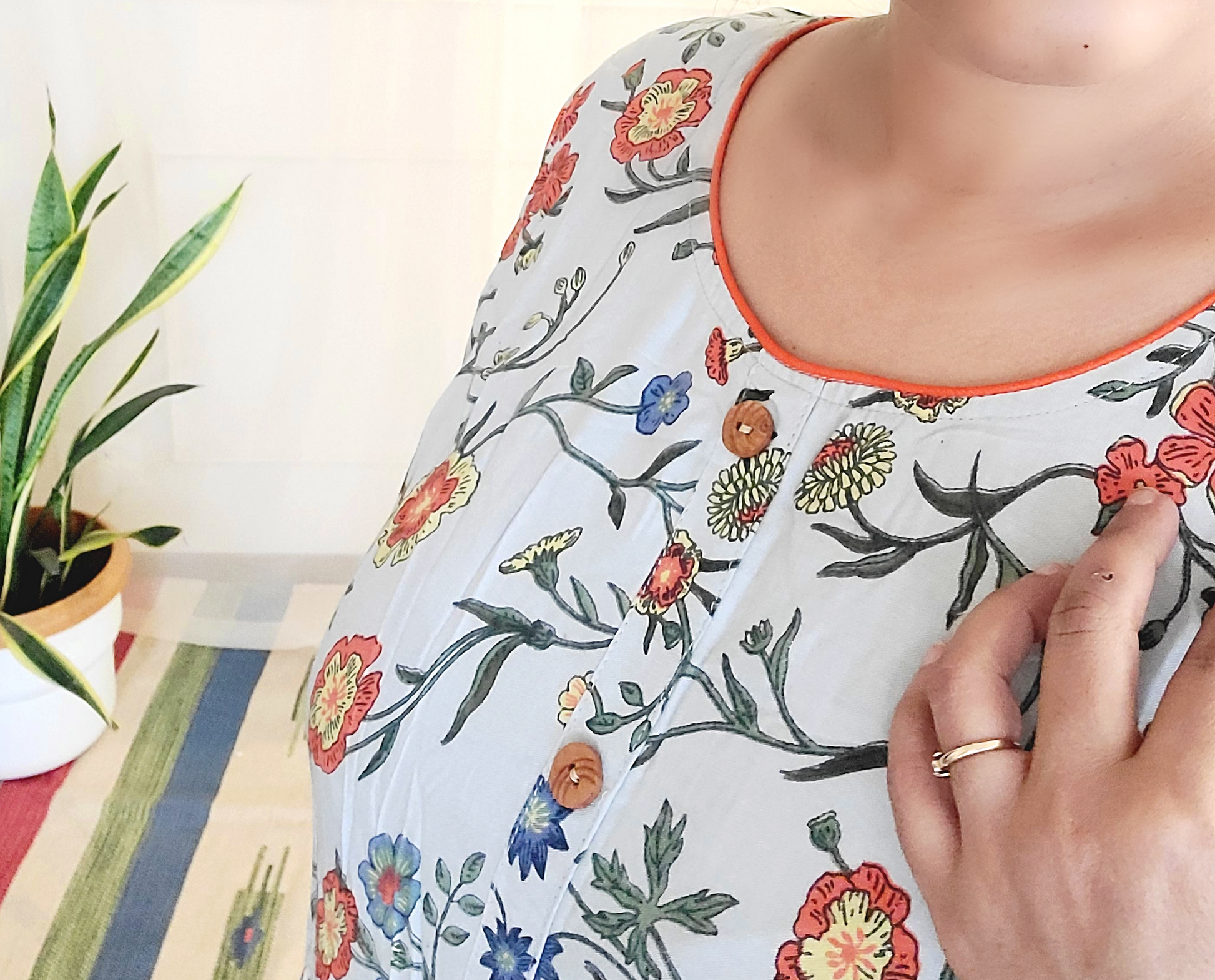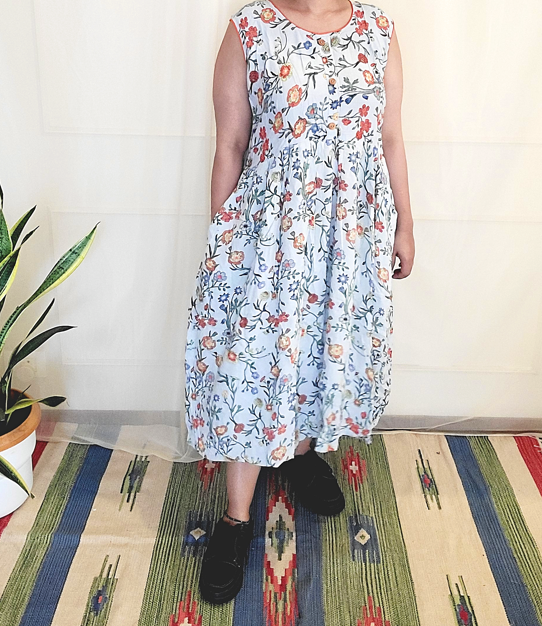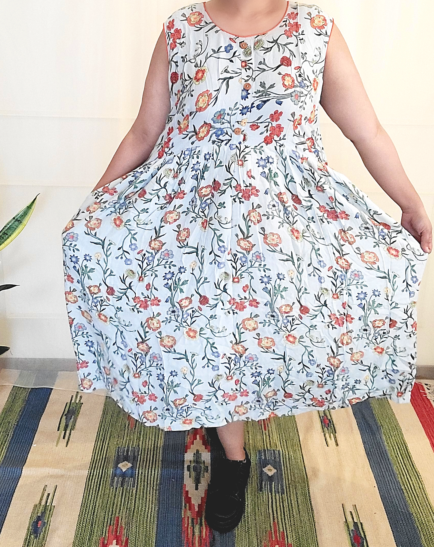 **2. Premium Indian Cotton Fabric:** Crafted from high-quality Indian cotton, this dress promises all-day comfort. Known for its softness and breathability, Indian cotton ensures durability and a luxurious feel against your skin.