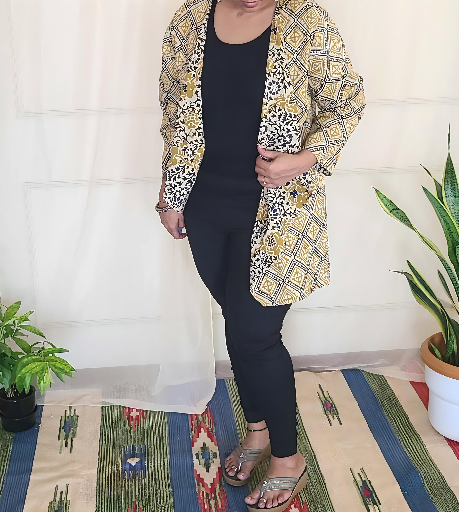 Embrace versatility with its reversible design, allowing you to effortlessly switch between captivating patterns inspired by the rich heritage of Bagru, the intricate motifs of Ajrakh, and the earthy charm of Dabu prints. Made from premium cotton, this jacket is not only a sartorial masterpiece but also a testament to sustainability and comfort.
