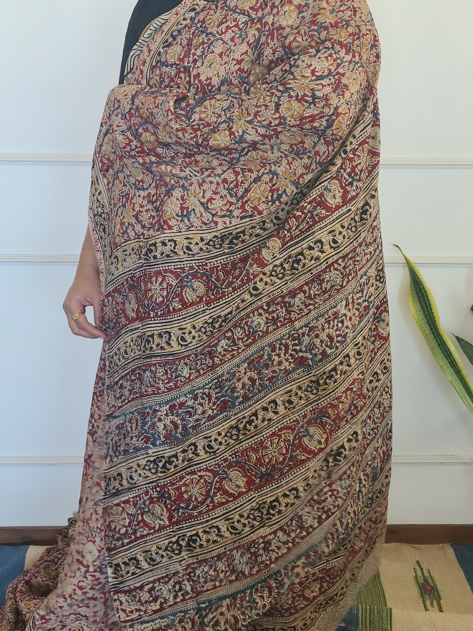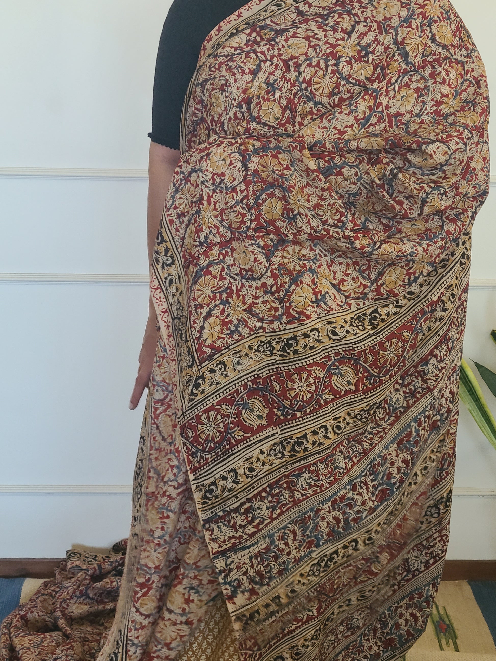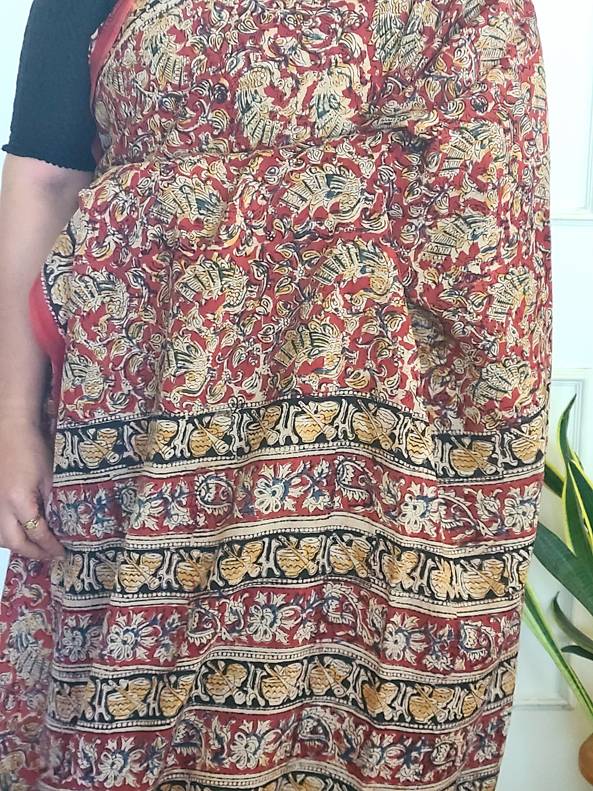 - **Handcrafted Kalamkari Art:** Each saree is adorned with intricate hand-painted Kalamkari designs, depicting traditional motifs and stories. The natural dyes used in Kalamkari art enhance the visual appeal and ensure eco-friendliness.