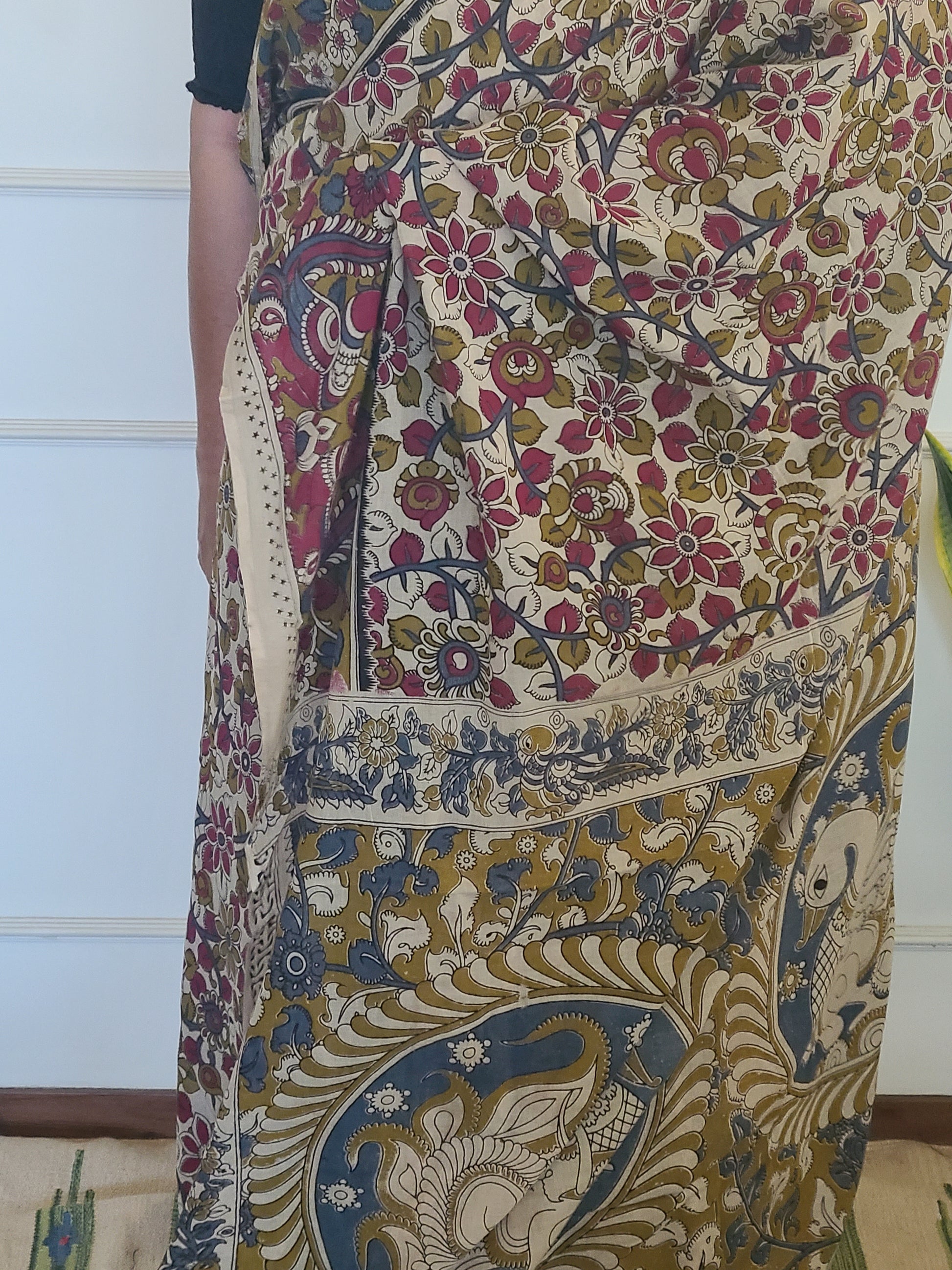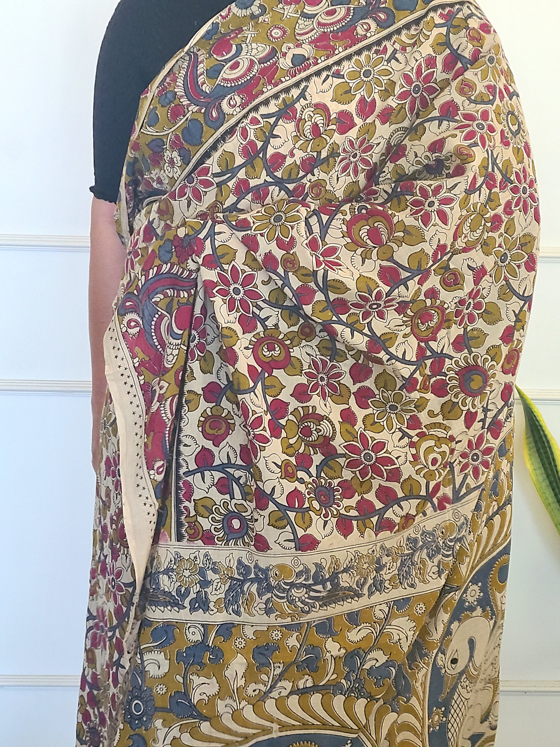 - **Handcrafted Kalamkari Art:** Each saree is adorned with intricate hand-painted Kalamkari designs, depicting traditional motifs and stories. The natural dyes used in Kalamkari art enhance the visual appeal and ensure eco-friendliness.