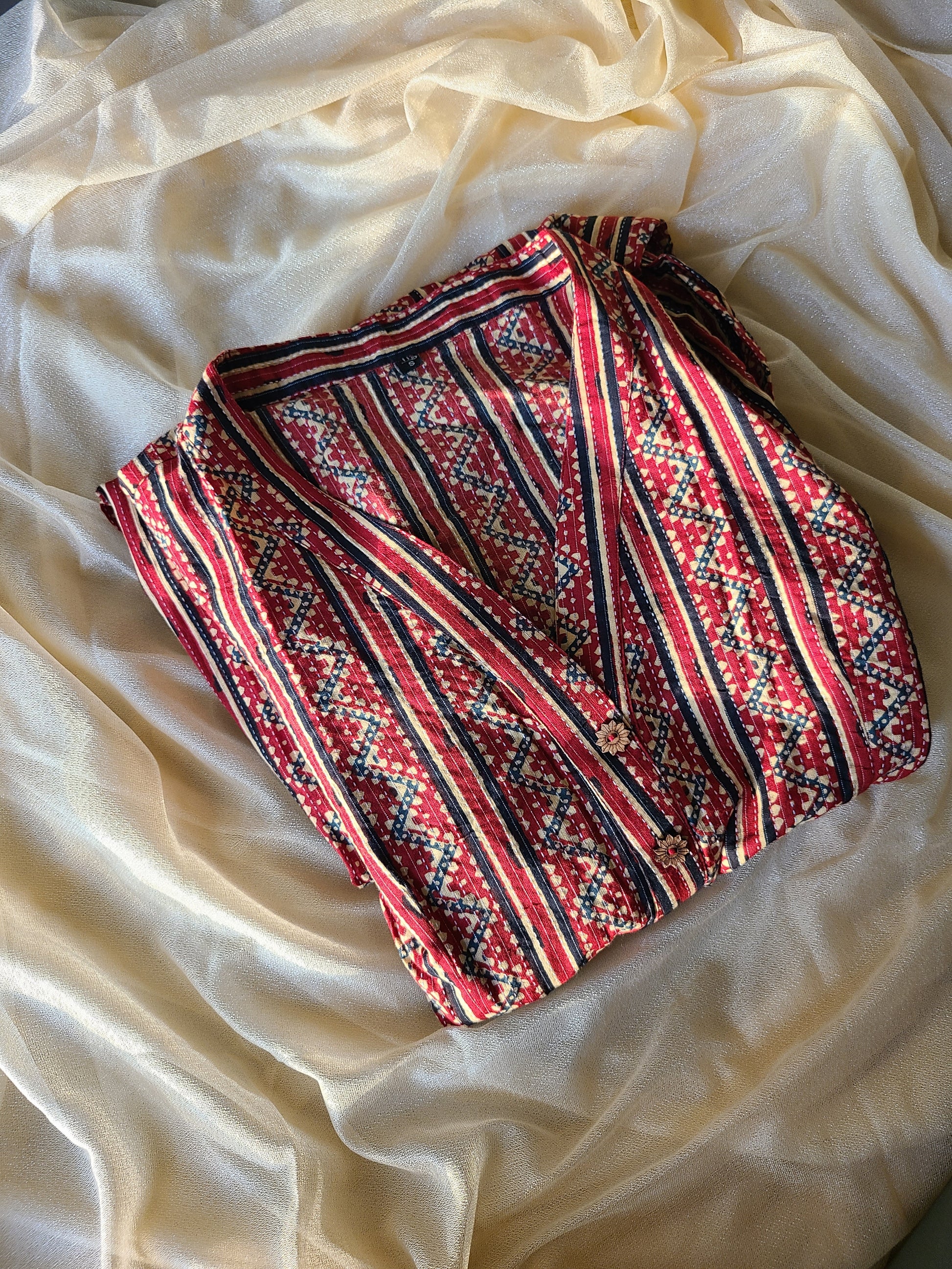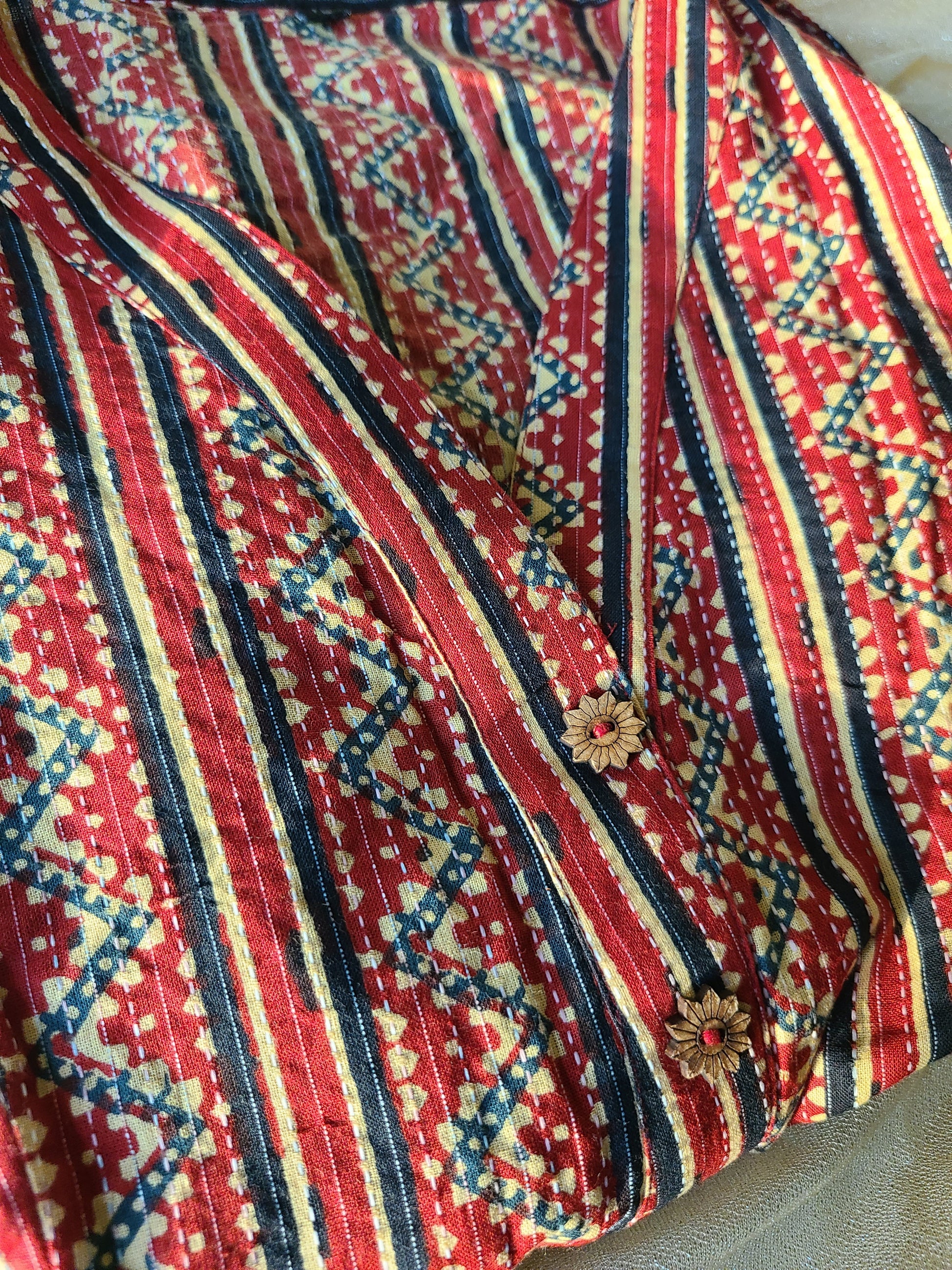 Fabrics: All products are pre-washed. We suggest gentle machine washing in cold water with mild detergent. Bright colors(Plant dyed) should be washed separately for first few washes Do not soak. Do not scrub and wring. Do not bleach. Best way to dry bright, cotton or linen fabrics is line dry in shade or medium tumble dry.