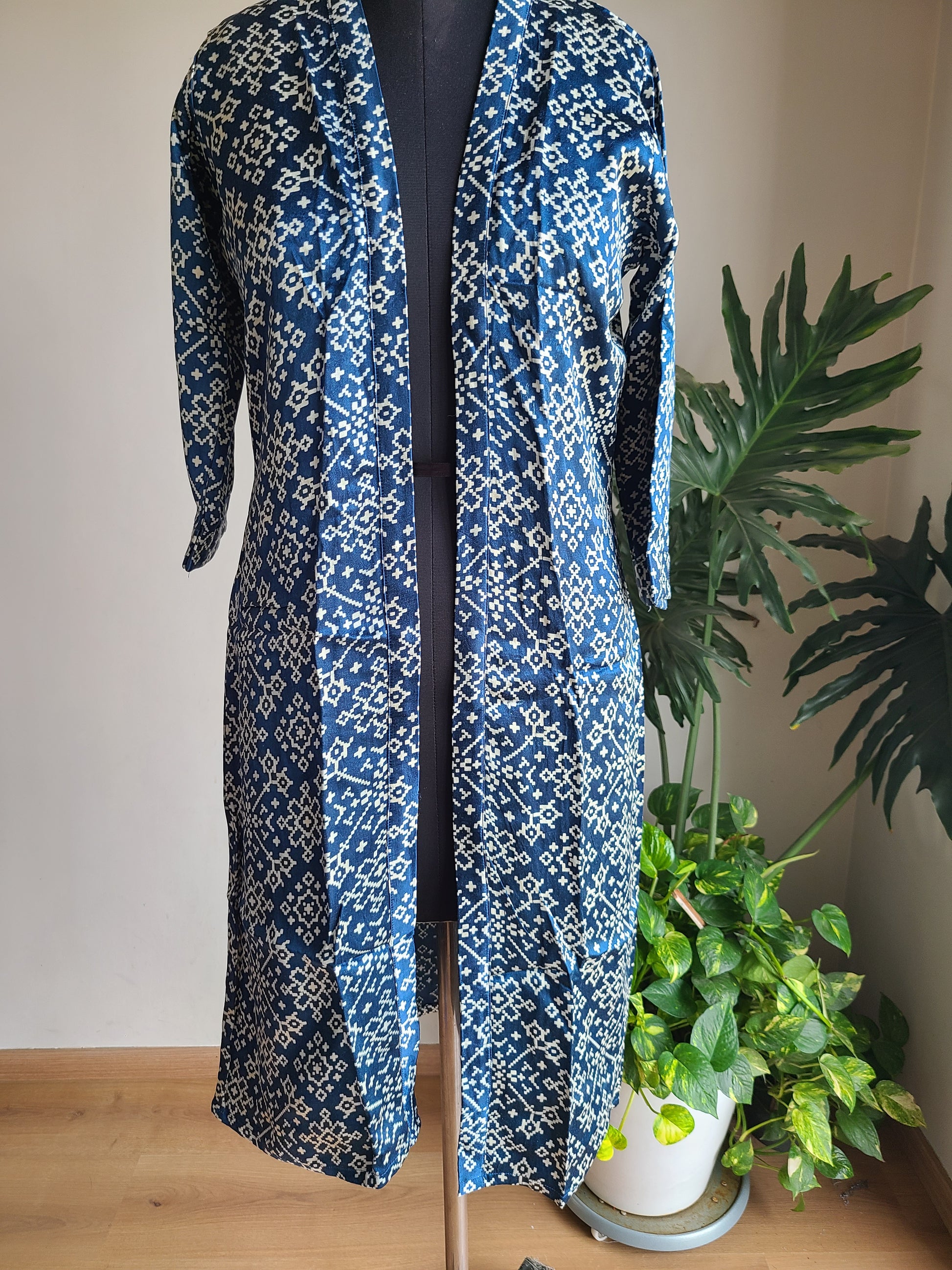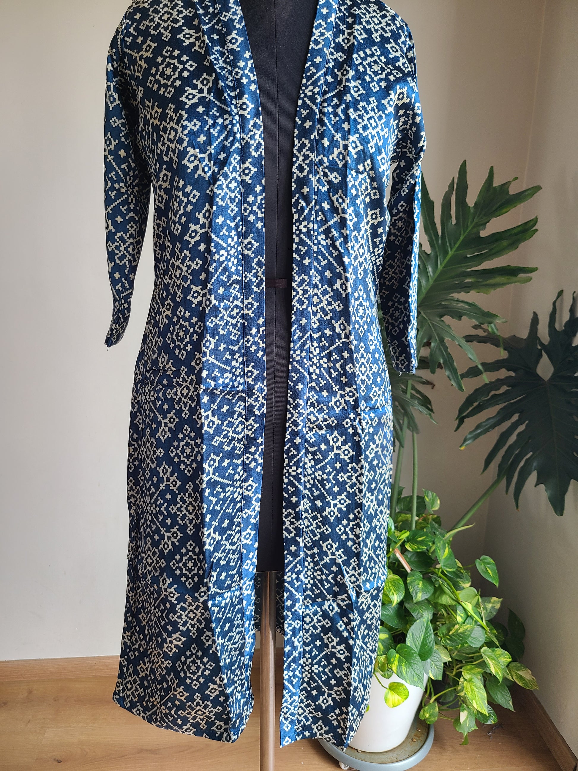 Elevate your wardrobe with our exquisite Long Shrug crafted from luxurious Ajrakh Mashru silk fabrics. Renowned for its rich cultural heritage and superior craftsmanship, each piece is a testament to timeless elegance and artisanal skill.