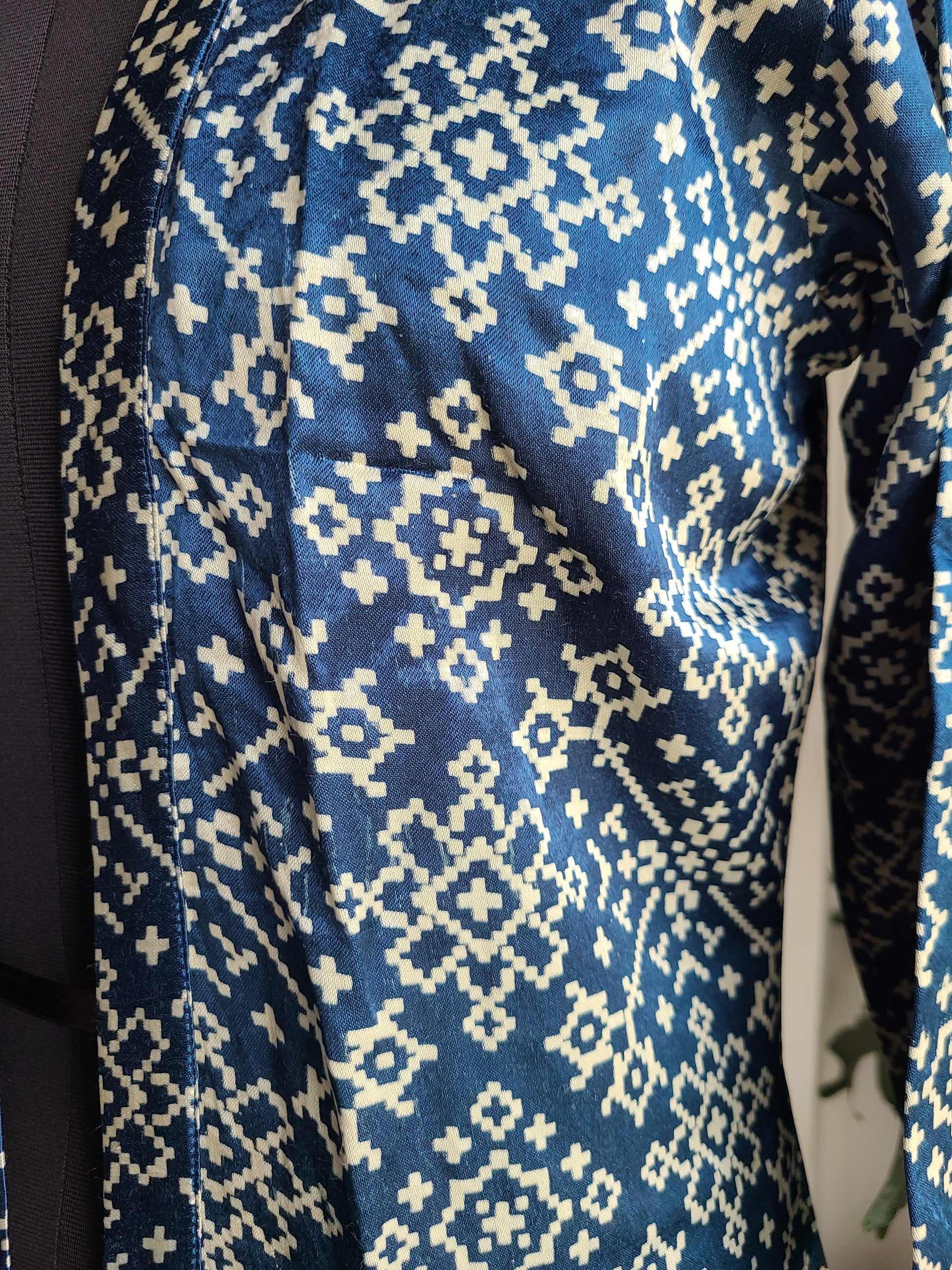 Whether you're dressing up for a special event or adding a touch of ethnic flair to your everyday look, our Ajrakh Mashru silk Long Shrug promises to be a cherished addition to your collection. Embrace the allure of heritage craftsmanship and indulge in timeless sophistication with every wear.